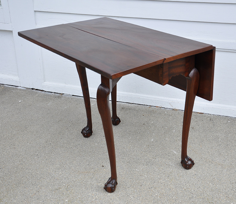 Excellent mahogany ball & claw-foot small drop-leaf table with a drawer on one end, probably Salem, Mass. area (from the shape of the leg), circa 1760. Note, it is very unusual for this type of table to have a drawer. Also note, that the drawer front is made from the same board as the end of the table. Ht. 27"; W. 32 3/4"; D. 13" (leaves down). Good small size.